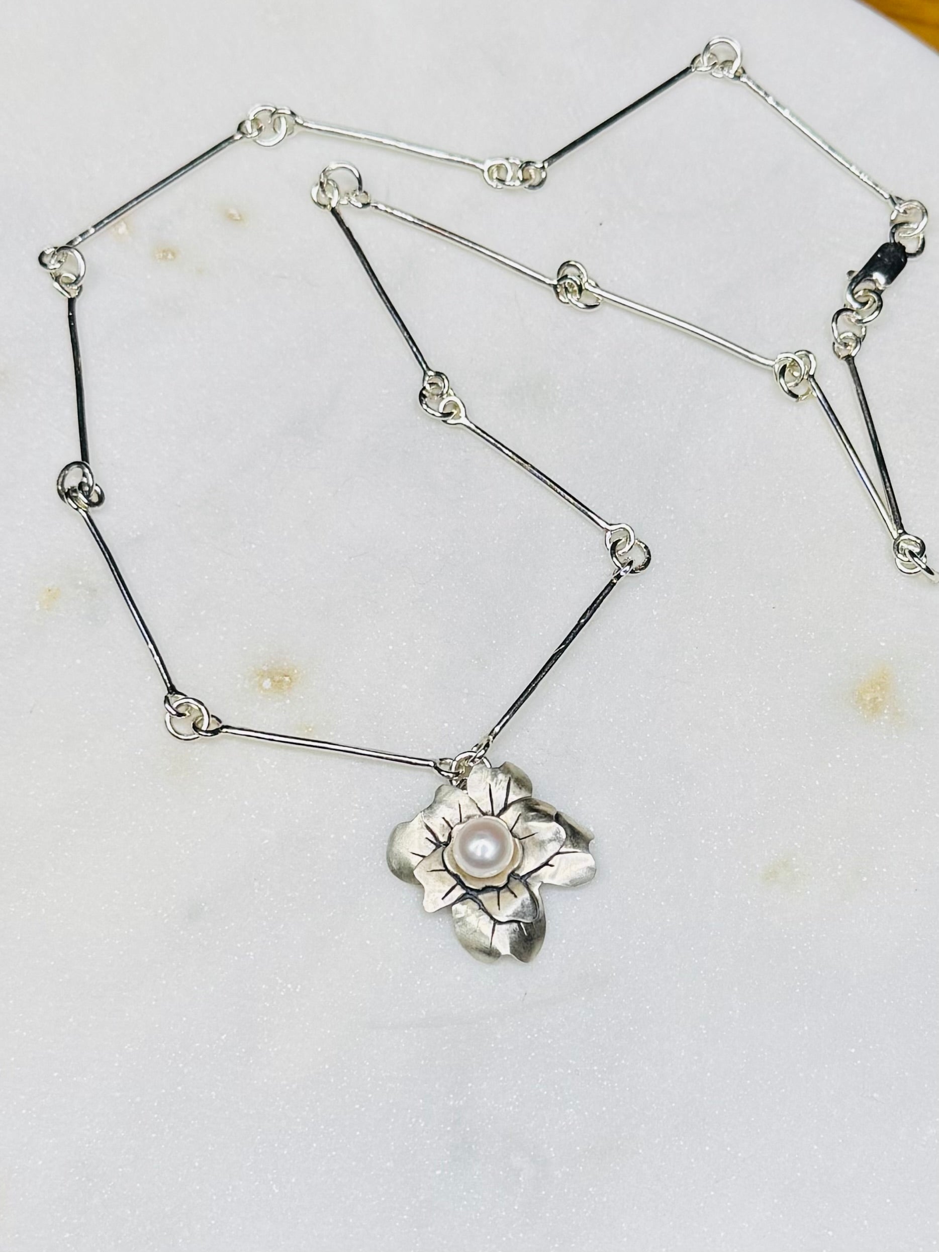 The Flora Necklace is a handmade .925 sterling silver and fresh water pearl necklace Entirely hand forged with silver sheet and wire.