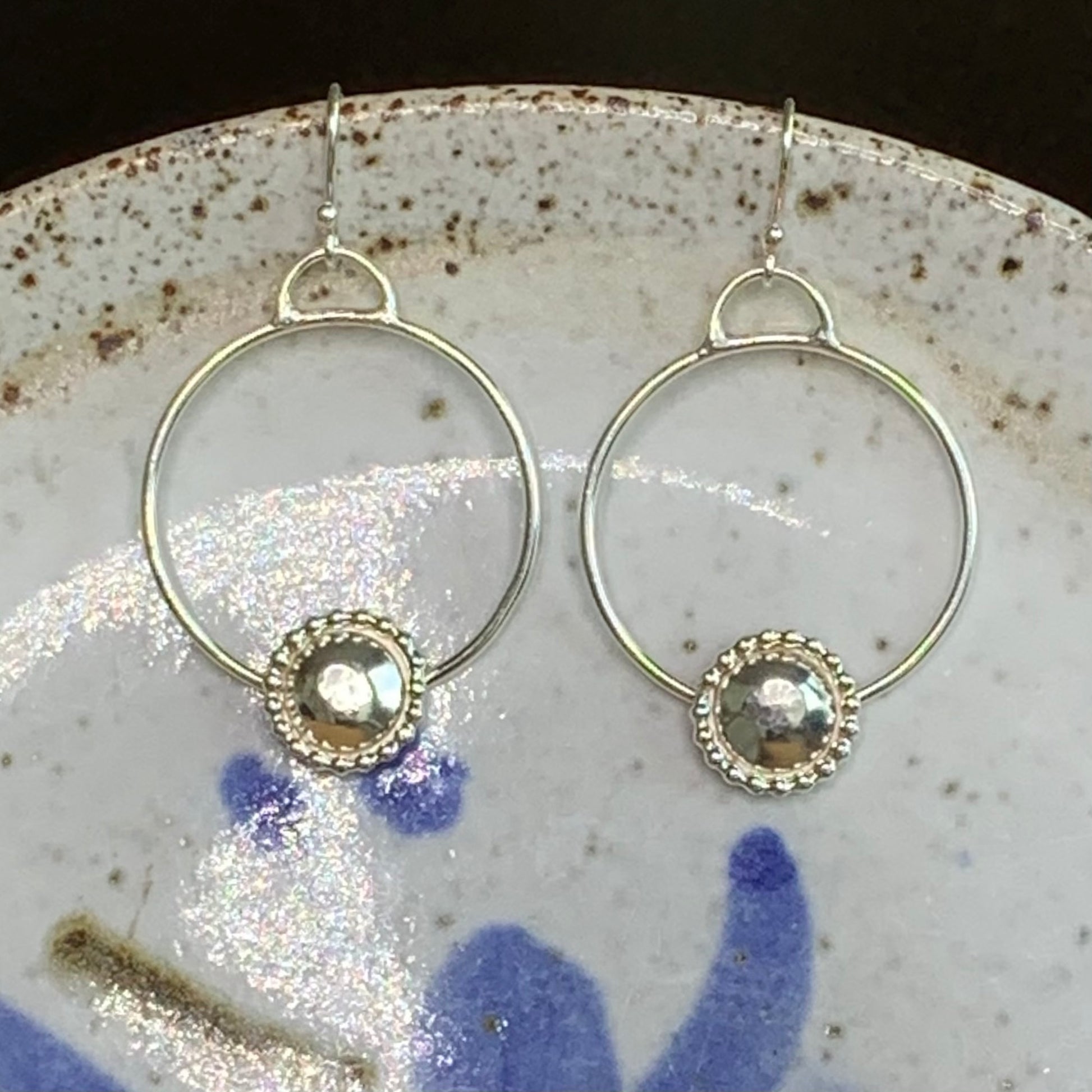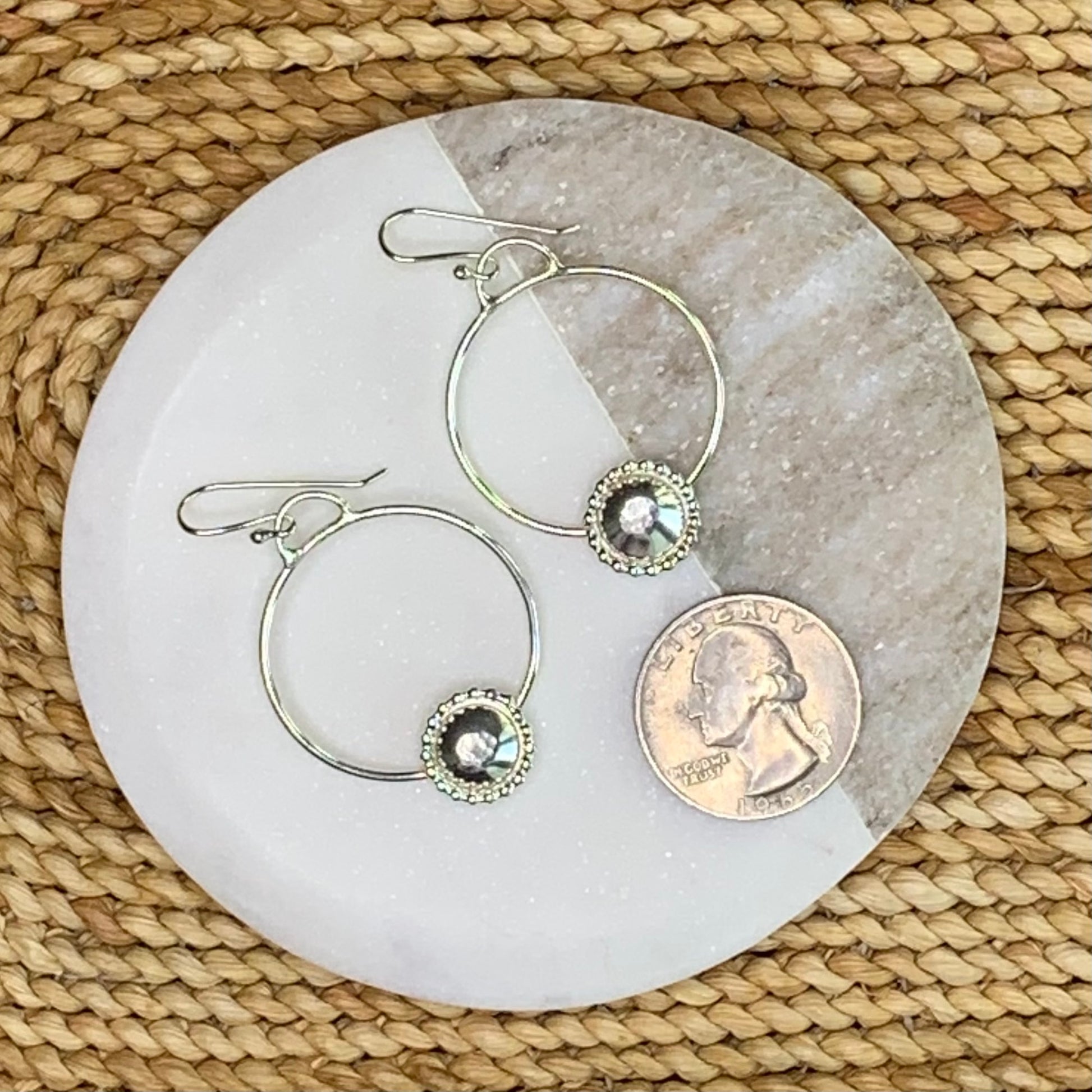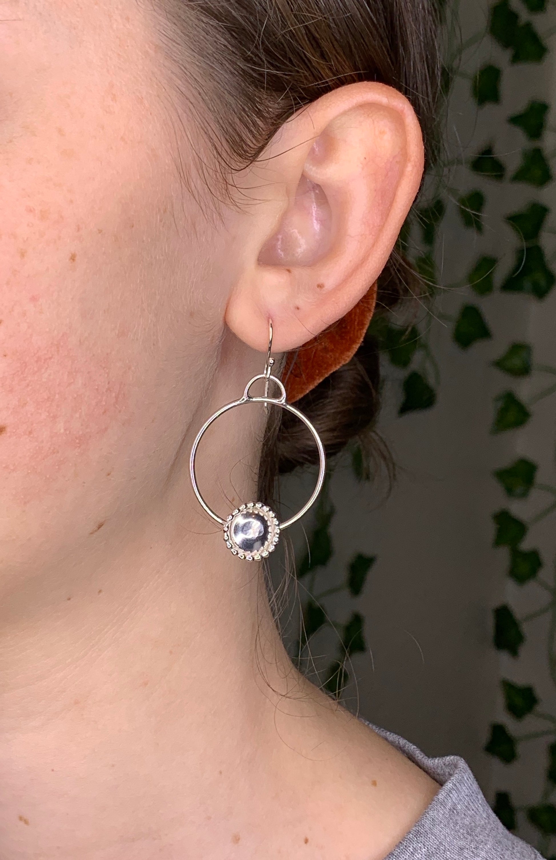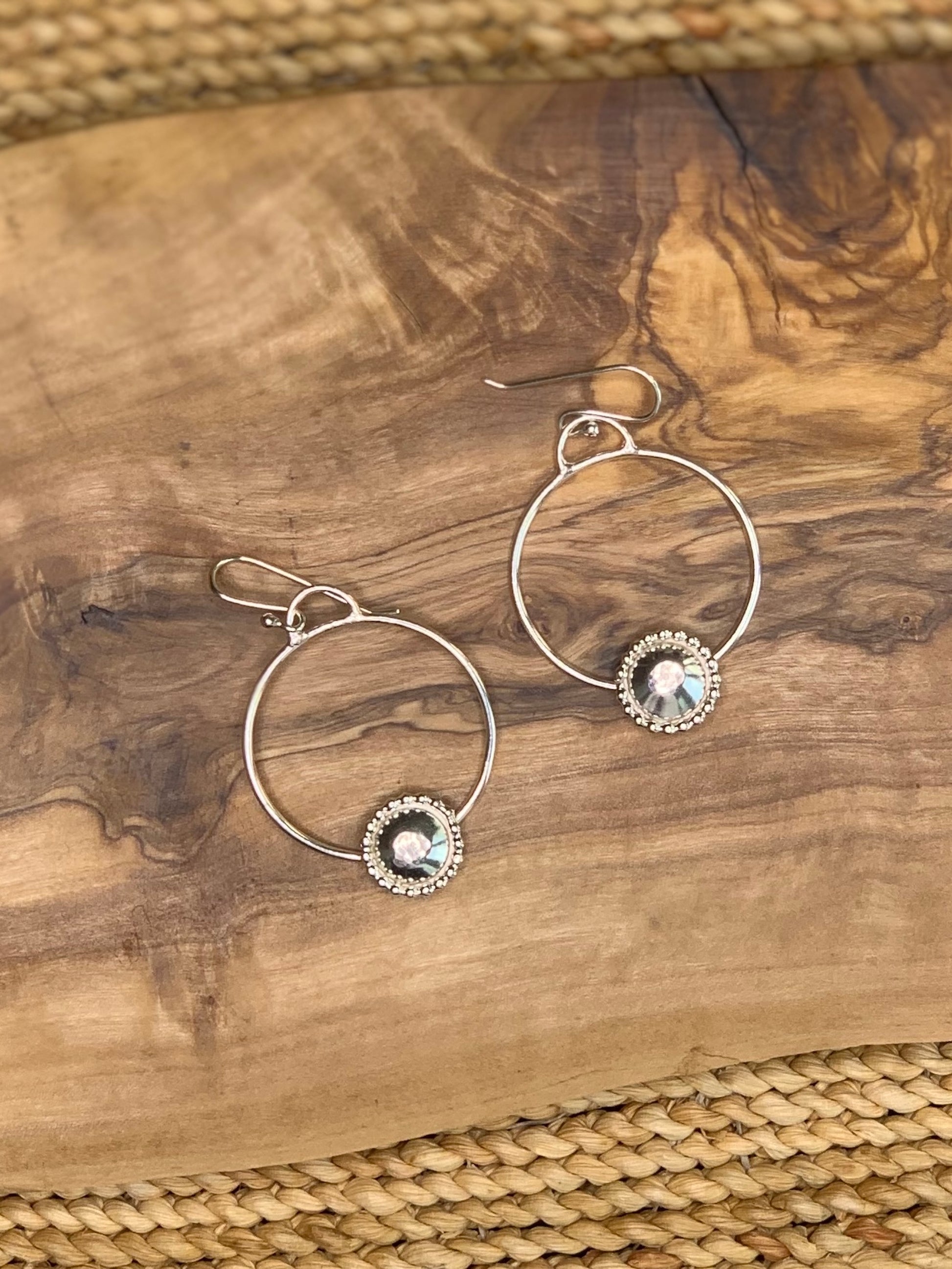 The Marinha Hoops are handmade .925 sterling silver dangle hoops with embellishment earrings. Handmade ear wire with clear rubber bullet clutch earring safety back.