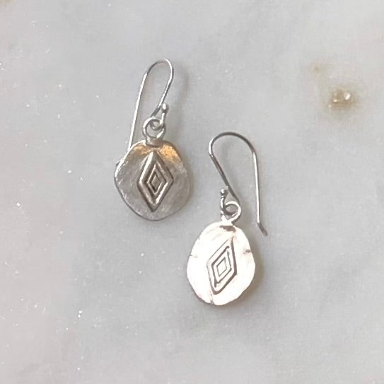 Handmade .925 sterling silver recycled silver disk drop earrings. Hammered disk made with recycled sterling silver melted down and hand formed into disk shape, with diamond shaped overlay. Sterling silver handmade earwire. Dime size.